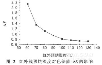 涤纶织带经过前处理和浸轧染液工序后,在进入发色箱之前一般要经过红外(线)预烘处理,以防止在烘干过程中发生染料泳移现象,避免色花和正反面色差等染疵。图2为红外线预烘温度对织带染色正反面色差的影响。
