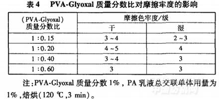 (1)以PA乳液、聚乙烯醇和乙二醛为原料,制备了PA/(PVA—Glyoxa1)LIPN涂料印花黏合剂,与单纯的PA乳液黏合剂相比,织物的耐摩擦色牢度提高。
