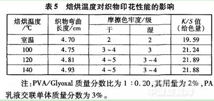 LIPN黏合剂主要由PVA和乙二醛进行缩合反应达到交联,焙烘温度对此缩合反应的交联程度影响较大。不同焙烘温度下,LIPN对印花棉织物的手感、沾色性能和给色量(K/S值)的影响如表5所示。