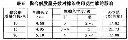 黏合剂是涂料印花色浆的主要组分,其用量对涂料印花的性能影响较大。试验研究了LIPN黏合剂用量对棉织物印花性能的影响,结果见表6。