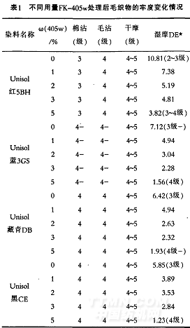 表1中的实验数据表明.经FK-405w处理后,毛织物的湿摩擦牢度有明显提高.但不会影响织物的其它牢度,布面观察来看.色光儿乎没有变化。整理剂的用量控制在4%~5%(owf)较为适宜,用量过多会对企业造成较大的成本压力。对于聚合物FK一405w提高毛织物的湿摩擦牢度的具体作用原理.笔者认为主要有以下几点。