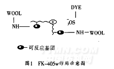 各类染料与纤维的结合方式有化学结合(离子键、共价键和配价键)和物理结合(氢键和范德华力).充分利用这些结合方式也是提高织物色牢度的有效方法。FK一405w中有可反应性基团.可以与纤维及染料分子中的活性基团(如一OH。一NH:等)发生共价交联反应;该高分子聚合物含有大量氢键,能与纤维和染料形成良好的结合.并且该高分子聚合物与纤维和染料间还存在范德华力的作用.这样使染料、纤维更为紧密牢固地联系在一起。防止染料从纤维上脱落。从而大幅提高织物色牢度(如图l所示)。