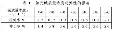 采用布铗丝光机对织物进行碱处理。轧车压力0. 15MPa,张力0. 2MPa,织物不上铗,处理时间90 s,碱质量浓度对织物弹性的影响见表1。