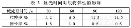织物不上布铗,碱质量浓度250 g/L,丝光时间对织物弹性的影响见表2。