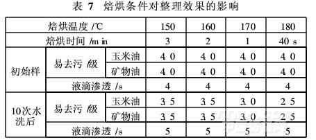 采用易去污整理剂PFSR-2 80 g/L,二浸一轧,轧余率60%,预烘温度110℃,时间2 min,焙烘条件对整理效果的影响见表7。