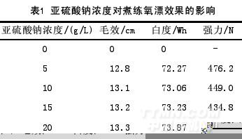 由表1可以看出,在试验浓度范围内,织物白度随着亚硫酸钠用量的增加而提高。这说明亚硫酸钠具有一定的去除木质素的作用。木质素是一类以苯丙烷为结构主体的三维网状高分子化合物,具有多种官能团。在碱性溶液中木质素中的苯丙烷结构易转变为亚甲基醌的结构,亚硫酸根离子(SO32-)对于木质素苯环中醌型结构的α-碳正原子具有强的亲核作用从而使得木质素磺化,进而苯丙烷单元结构之间断键,木质素由大分子变成可溶的小分子木质素磺酸盐[2],达到除去织物木质素的目的。当亚硫酸钠浓度超过15g/L时白度增加趋缓,毛效稍微降低,而强力则大幅下降。综合三者考虑,亚硫酸钠浓度取10g/L左右比较适宜。