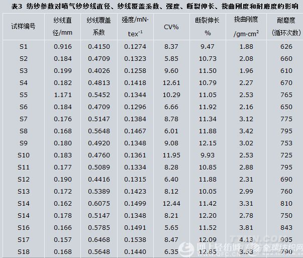 Grosberg等发表的文章认为:纺纱速度提高,当纱线张力较低时会形成气圈。低张力时气圈会增大,纺纱区的低张力导致纱线结构的紧密度减小。本文的研究表明:纺纱速度改变时,纱线直径随之变化的趋势也支持这个假说。表3显示了纺纱速度对纱线张力特性的显著影响。由表可知:当纺纱速度达到190 m/min时,纱线强度最大。随着纺纱速度继续提高到190m/min以上时,纱线强度降低。纱线强度增大是因为纺纱速度的提高使包缠纤维数量增加,纤维长度增加,纱线覆盖系数提高。纺纱速度继续增至190 m/min以上后纱线强度减小是因为单位长度中包缠纤维的减少、纱线覆盖系数减小。