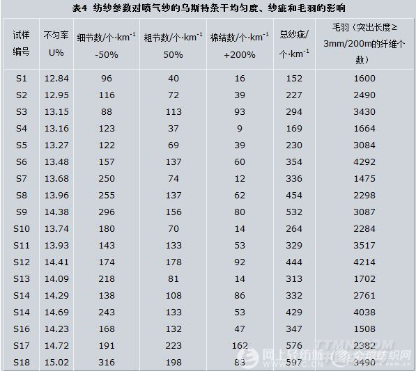 表4表明了纺纱速度对每200 m纱线长度中突出长度大于3mm的纤维个数的影响。观察得出:随着纺纱速度的提高,毛羽数急剧增加。当速度增至对加捻运动产生影响时,更多的纤维从中心纤维束中脱离,从而产生更多的突出端。这种纤维接着就形成了毛羽。由表4可看出:纺纱速度的提高使纺制的纱线变细,但同时恶化了条干均匀度。这是因为纺纱速度提高,前罗拉转速增加,气流浮动加剧了对前罗拉后部纤维的干扰。另外可以看出:尽管单项纱疵指标,即千米细节、粗节和棉结数与不匀率u%值遵循不同的变化趋势,但总纱疵与不匀率U%值的变化趋势一致。