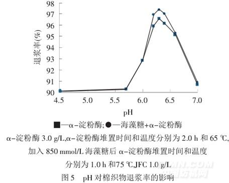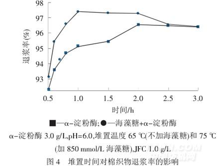 从图3 可以发现,随着堆置温度的升高,2 种工艺条件下,棉织物的退浆率均呈现先升后降趋势.65 ℃时,α-淀粉酶处理棉织物的退浆率最高,之后,随着温度升高,退浆率降低.与α-淀粉酶退浆效果比较,加入海藻糖后,其最佳堆置温度提高到75 ℃.可见,海藻糖的加入能有效提高α-淀粉酶的热稳定性,且使得α-淀粉酶在较高温度下能继续保持活力.所以,在有海藻糖的α-淀粉酶退浆工艺中,其最佳堆置温度可以设为75 ℃.