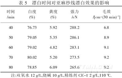 从表5 可知,白度随处理时间的延长先升后降,黄度先降后升,强力损伤依次下降.毛效随处理时间延长而提高,≥60 min 时趋缓.综合考虑,漂白时间以60min 为宜.