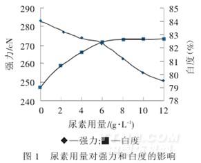 尿素与过氧化氢相互作用形成了一个复合物,以促进过氧化氢较快分解且形成有效分解.[5]从图1 可知,随着尿素用量的增大,白度逐渐增加,强力逐渐减小;6 g/L 时,白度较高,强力下降幅度较小;当>6 g/L 后,由于尿素的活化作用大,使双氧水的分解过快,不能有效地漂白纤维,对纤维损伤较为严重,白度增加也不明显,故尿素用量确定为6 g/L.