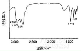 由图2可以知道,2966cm-1处的吸收峰为甲基的不对称伸缩振动引起;1367cm-1和1449cm-1处吸收峰可归于甲基的不对称弯曲振动和对称弯曲振动;2929cm-1、2841cm-1和1449cm-1处的吸收可分别归为亚甲基的不对称伸缩振动、对称伸缩振动及弯曲振动。由上述分析可知,在1,4,7一三氮杂环壬烷(TACN)上已成功引入甲基。