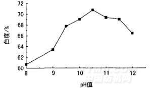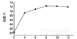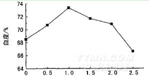 双氧水漂白时,为了控制双氧水的分解和防止产生破洞,通常在漂液中加人稳定剂,以有效地螯合Cu2+、Fe3+、Mn2+和Ni2+等金属离子。图8为稳定剂用量对织物白度的影响。