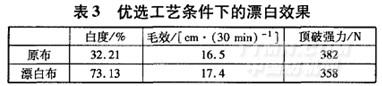 根据上述单因素试验结果,优化的漂白工艺条件中的活化作用是:3O%H2028g/L、配合物10~mol/L、渗透剂1g/L、稳定剂DTA1.0g/L、pH值为1O,织物在6O℃下浸渍漂白60min;热水洗两次,冷水充分洗涤,烘干。漂白布样的白度、毛效、顶破强力见表2。