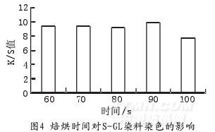 从图中不同的焙烘时间对S-GL染料所染布的K/S值,图4可以看出5种焙烘时间K/S值差别不是很大,故综合取90 s为最佳热熔焙烘时间。