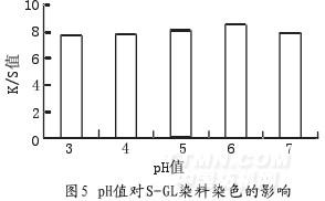 本实验用冰醋酸对染液的pH值进行控制,从图5可以得出当pH值在5~6时,织物的K/S值最大,反映了染料上染纤维量最大。与以往的论文文献所得出的结果相吻合。