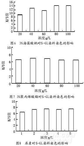 图6、7分别为海藻酸钠和聚丙烯酸酯对染料染色的影响,通过图6和图7可以看出,随着海藻酸钠量的增加,染料上染率会增加,织物颜色加深,而聚丙烯酸酯类则没有很大变化;从匀染效果来看,两者接近;染色后若要经过树脂整理,海藻酸钠本身对织物就有硬挺的效果,则优先考虑使用海藻酸钠,本文工艺采用3%海藻酸钠80g/L。