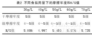 通过表2可以看出不同食盐用量的K/S随着食盐用量的增加而增加,呈递增趋势,而且摩擦牢度均较好。所以秉承着减少污染,降低消耗的原则,本实验选择50g/L的食盐用量。