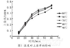 由上图可明显观察到,随着时间的增加上染率不断增加。从图中可以看出,温度为50℃时上染曲线明显落后与其它温度,而当温度在60℃~90℃范围内时,随着时间的推移上染率曲线的差异不大,最终的上染率也很接近。