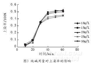 由上图可以明显观察到,当纯碱用量在25g/L和30g/L时加入纯碱后的上染率明显低于20g/L和以下用量时。