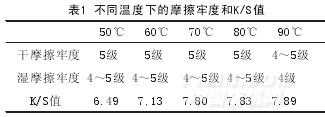 由表1可以看出在70℃后大麻织物的表面得色量K/S值相差不多,得色情况较好,摩擦牢度也较好。结合图1和表1在70℃情况下为活性黄BES的染色情况较好,与高温时相差不大,所以本着节约的原则选取70℃时对该大麻织物进行染色。