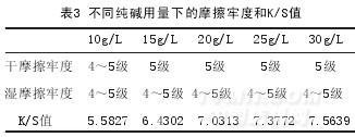 通过表3可以看出不同纯碱用量的K/S随着纯碱用量的增加而增加,呈递增趋势。在加入20g/L和更多纯碱后能取得较好的表面得色量,并且能取得较好的摩擦牢度,所以纯碱用量可控制在20g/L或更多的情况。