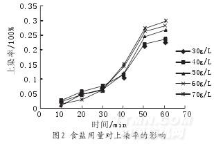 由图2可以明显观察到,随着食盐用量的增加染料的上染率增加。通过图中数值分析得出在70g/L食盐用量下的最终上染率最高,但考虑到50g/L、60g/L、70g/L降低的值差别不大。