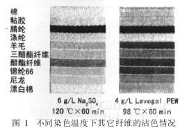 CDP纤维用阳离子染料染色时,需在高温条件下进行,以利于染料的渗透,对比98℃(加载体)以及120℃染色,可以发现,在较低的染色温度下,对其它纤维沾色严重,如图1所示。