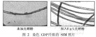 CDP纤维在高温条件下易水解,会降低纤维的强力,同时也使得表面得色变浅。若在染色配方中加入6 g/L元明粉,则可防止纤维水解,如图2所示。