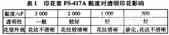 印花浆FS-4]7A的黏度对透明印花影响很大。黏度大,透浆量少,透明性差;黏度稀,透浆量大,透明性好,但容易造成渗化,结果见表1。