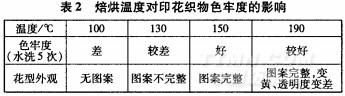 表2中,焙烘温度150℃,印花织物色牢度好。
