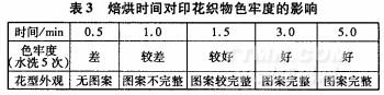 表3中,焙烘时间3min,印花织物色牢度好。