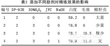 由1数据显示只有DP-928时,白度很低,毛效为0,大量棉籽壳,精练不达标。1、2白度可知H2O2的加入对白度有很大提高;2、3毛效结果显示渗透剂对毛效有很显著的作用;3、4白度毛效都无明显提高,所以NaOH是否需要加入需进一步探究;H2O2和渗透剂是必不可少的。