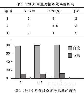 当H2O2为3g/L,渗透剂2g/L时,毛效好,且都差不多,表明DP-928的用量对毛效影响不大;而白度提高比较明显,当DP-928用量在2g/L以下时白度较低,布面效果不理想,有少量棉籽壳。所以确定DP-928用量为2g/L。