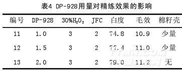 由上表可知DP-928推荐工艺处理的纯棉针织物白度和毛效都不够,与传统工艺相比相差很大,精练效果不达标;为此在下面的实验对DP-928进行工艺探讨,使其达到一定的白度和毛效,满足染色后处理的要求。