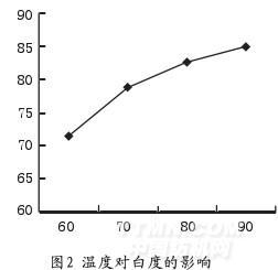 设定工艺条件:DP-928为1g/L,30%H2O2 3g/L,渗透剂2g/L,NaOH 1g/L,漂白时间60min,考察温度对精练效果的影响,对白度的影响见图6,