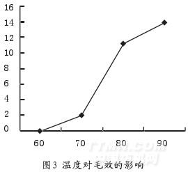 由图2可知:温度低于80℃时,织物白度随着精练温度的升高而迅速提高;超过80℃后,织物白度增加缓慢。说明精练工作液在80℃时已经处于较佳状态。而且温度低于80℃处理的白度都较低,布面有少量棉籽壳,处理不达标。