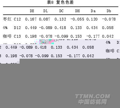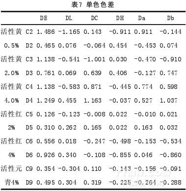 由表7、8可知:活性黄总色差DE超过1,其它DE误差都小于1;DL、DC、DH、Da、Db误差都很小,DP-928复合酶与传统精练剂比较近似,中深色中温精练剂相对接近传统精练剂,DP-928复合酶中深色偏深视觉上评级达到4~5级。