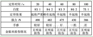 由表5可知,定形时间长,定形效果好,且对金银丝基本无损伤。但定形时间超过60s,白度、手感和强力下降明显,手感变硬。综合考虑,定形时间确定60s。