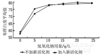 根据图2-4中曲线可以看出,氢氧化钠用量不同以及是否加入新活化剂对织物的漂白效果都有着较大的影响。