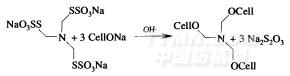 本实验研制了一种新型多官能团交联胺化改性剂TETS,其分子结构中含有1个叔氨基和3个反应性基团,碱性条件下可与纤维素分子上的羟基发生交联反应,并将叔胺基团引人到纤维上,发生交联胺化改性.反应式如下: