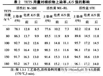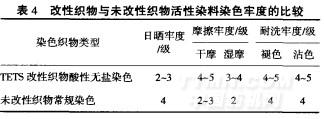 3.1TETS改性处理为纤维素纤维交联胺化改性提供了一条新的途径.TETS改性棉纤维的染色性能发生了很大的变化,活性染料上染率和固色率明显提高."lETS改性织物可以进行酸性(或中性)、无盐(或低盐)染色,对解决传统活性染料存在的固色率低、大量无机盐促染造成的环境污染问题具有重要的现实意义.