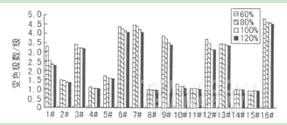 而4#粉红、8#酞蓝、11#石绿、14#桔黄等织物在带液率60%的情况下,变色级数已较低,说明染料易受到破坏,当大部分染料受到破坏后再增大织物带液率,变色程度亦不再发生变化。该现象与2.1节中的受氯化水浓度影响一致。