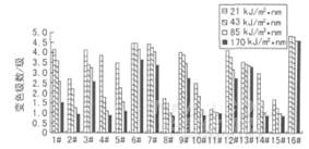 由图4知,随着辐照量增加,织物变色程度均增加。除变色级数处于低水平的11#石绿色织物和变色级数处于高水平的16#黑色织物外,其它织物变色级数降幅均较大。如1#枚红色织物的变色程度由21kJ/(m2·nm)辐照后的4.153级降到170kJ/(m2·nm)辐照后的1.504级,下降了2.649级。