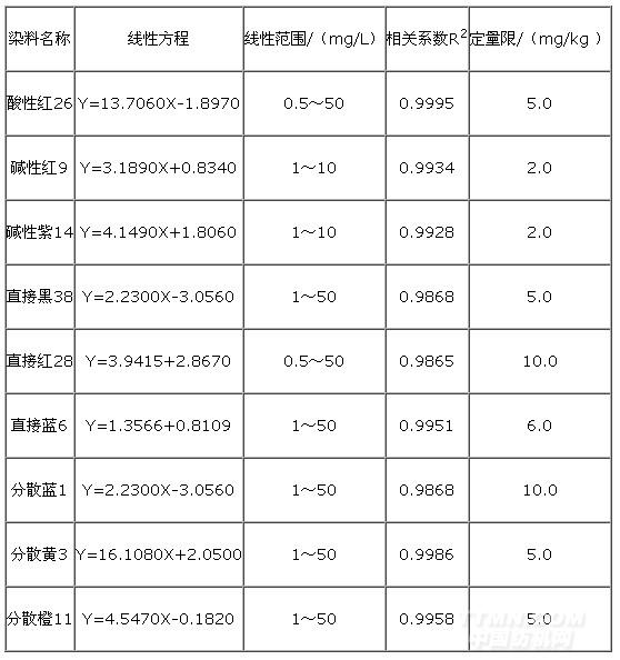 表2 9种染料的线性回归方程与定量限