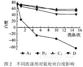 为进一步探讨漂白活化剂对氨纶弹性织物的影响,将氨纶丝放入自制的针织袋中,连同棉/氨纶织物按1.2.1洗涤方法洗涤,测试氨纶丝白度变化,结果如图2所示。
