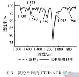 图3是经洗涤剂B洗涤15次后黄变的氨纶丝和未洗涤氨纶丝在600~1 800cm-1处的红外谱图。从图3可以看出,两个谱图基本相似。但黄变后氨纶丝在1 573cm-1处苯环的C C伸缩振动吸收峰减小,且对应的796cm-1处苯环C-H振动吸收峰减小,这说明分子中苯环发生了变化;1 540cm-1处的C-N吸收峰减小,而在1 730cm-1处双键吸收峰有所增加,这说明分子中C-N键断裂,形成C N亚胺结构。1 259cm-1、1 018cm-1处醚键吸收峰也相应减小,说明分子中醚键也受到了影响。