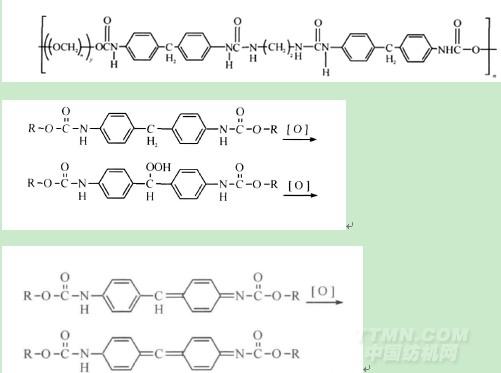洗涤时漂白剂释放出活性氧,在金属漂白活化剂存在条件下,活性氧活性大大增加,氨纶分子中异氰酸酯中甲基与活性氧结合,生成不稳定的氢过氧化物,进而生成发色基团醌-酰亚胺结构,该结构导致氨纶纤维的泛黄,经反复洗涤后,醌-酰亚胺结构可进一步被氧化,生成二醌-酰亚胺结构,纤维颜色继续加深[6],反应式如下