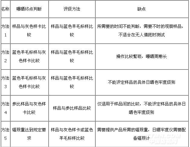 我国现行的纺织品日晒色牢度实验方法标准主要是GB/T 8427—2008《纺织品 色牢度试验 耐人造光色牢度:氙弧》[3]。标准介绍的5种不同的曝晒方法各有不同缺点,详见表1。