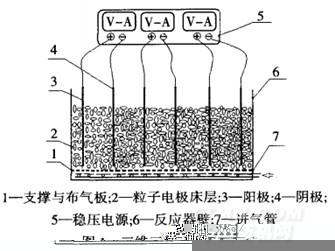 试验装置如图1所示,由反应器和空气泵组成.多电极填料床三维三相电催化反应器由有机玻璃制成尺寸为30cmx18cmx10cm,阴阳极极板尺寸均为1cmx4cm阴阳电极包裹一层尼龙网以避免旁路电流和短路电流,阴、阳电极间隔距离为5cm,填充活性炭堆积体积2L.